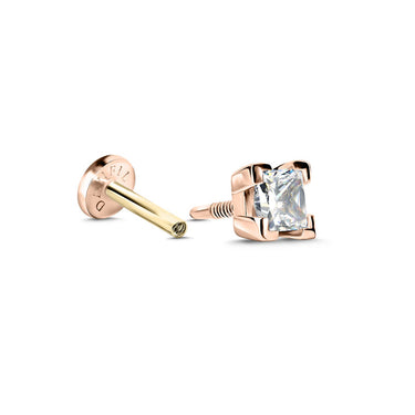 Jemná piercingová labreta z růžového 14 karátového zlata s vnitřním závitem, která je zakončena laboratorně vytvořeným diamantem Princess brusu o váze 0,137 ct a rozměrech 2,7 × 2,7 mm. Je vhodná pro typ piercingu helix, tragus, lobe, conch a flat. Tloušťka tyčinky je 1 mm. Šperk lze použít pro první aplikaci piercingu. Součástí šperku je certifikát pravosti.