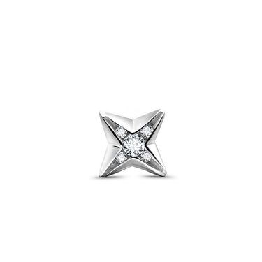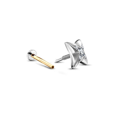 Jemná piercingová labreta z bílého 14 karátového zlata s vnitřním závitem ve tvaru hvězdy s pěti brilianty o celkové váze 0.03ct. Je vhodná pro typ piercingu helix, tragus, lobe, conch a flat. Tloušťka tyčinky je 1mm. Šperk lze použít pro první aplikaci piercingu.