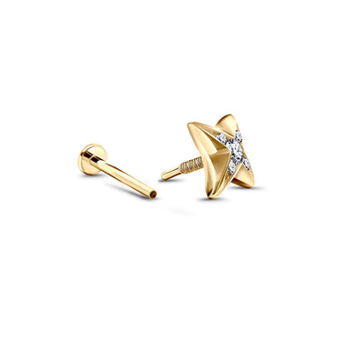 Jemný piercingový labyrint zo 14-karátového žltého zlata s vnútorným závitom v tvare hviezdy s piatimi briliantmi s celkovou hmotnosťou 0,03 ct. Je vhodný na piercing špirály, tragu, laloku, konchy a plochého piercingu. Hrúbka tyčinky je 1 mm. Šperk možno použiť na prvú aplikáciu piercingu.
