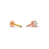 Jemný piercing z ružového 14K zlata s vnútorným závitom, ktorý je osadený okrúhlym briliantom s hmotnosťou 0,035 ct a priemerom 2,1 mm. Je vhodný pre helix, tragus, lalok, konch a ploché typy piercingu. Hrúbka tyčinky je 1 mm. Šperk je možné použiť na prvú aplikáciu piercingu.