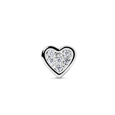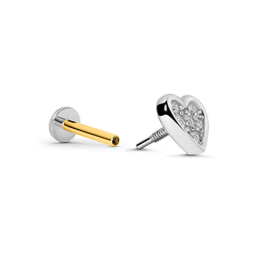 Jemný labyrint zo 14-karátového bieleho zlata s vnútorným závitom v tvare srdca a okrúhlymi brúsenými trblietavými diamantmi s celkovou hmotnosťou 0,024 ct. Je vhodný na helix, tragus, lalok, konch a plochý piercing. Šperk možno použiť na prvú aplikáciu piercingu.