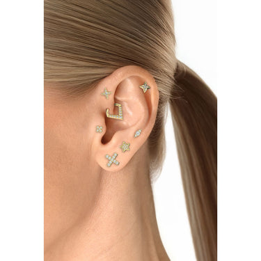 Jemný piercingový labyrint zo 14-karátového žltého zlata s vnútorným závitom v tvare hviezdy s piatimi briliantmi s celkovou hmotnosťou 0,02 ct. Je vhodný pre helix, tragus, lalok, konch a plochý typ piercingu. Hrúbka tyčinky je 1 mm. Šperk možno použiť na prvú aplikáciu piercingu.