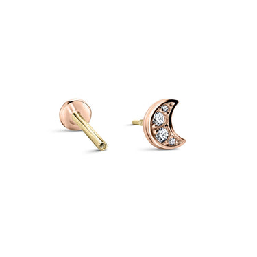 Jemná piercingová labreta z růžového 14 karátového zlata s vnitřním závitem ve tvaru měsíčku se čtyřmi brilianty o celkové váze 0.03ct. Je vhodná pro typ piercingu helix, tragus, lobe, conch a flat. Tloušťka tyčinky je 1mm. Šperk lze použít pro první aplikaci piercingu.