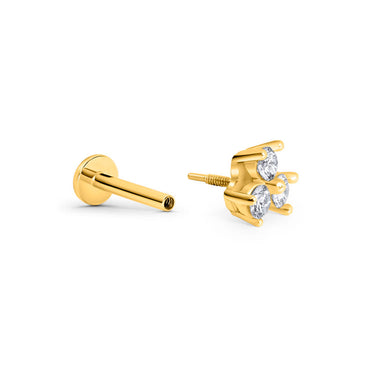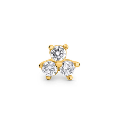 Jemný piercingový labyrint zo 14-karátového žltého zlata s vnútorným závitom, ktorý je osadený tromi briliantmi s celkovou hmotnosťou 0,165 ct. Je vhodný na piercing do špirály, laloku, konchy a plochého piercingu. Šperk možno použiť na prvú aplikáciu piercingu.