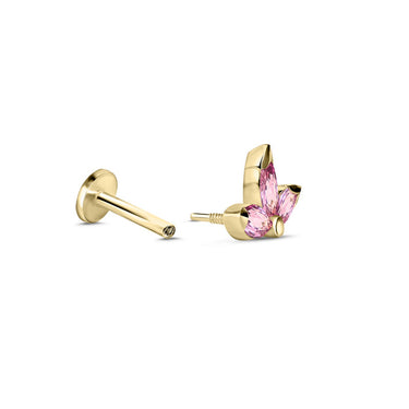 Jemný piercing do labretu zo 14-karátového žltého zlata s vnútorným závitom, ktorý je osadený tromi ružovými zafírmi s hmotnosťou 0,255 ct. Je vhodný pre helix, tragus, lalok, konch a ploché typy piercingu. Šperk možno použiť na prvú aplikáciu piercingu.