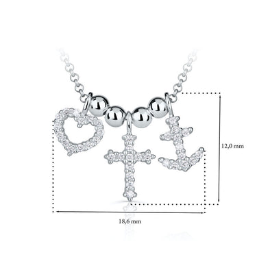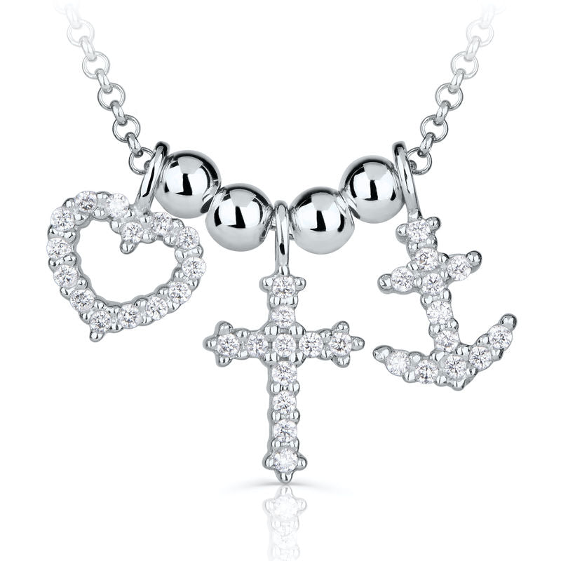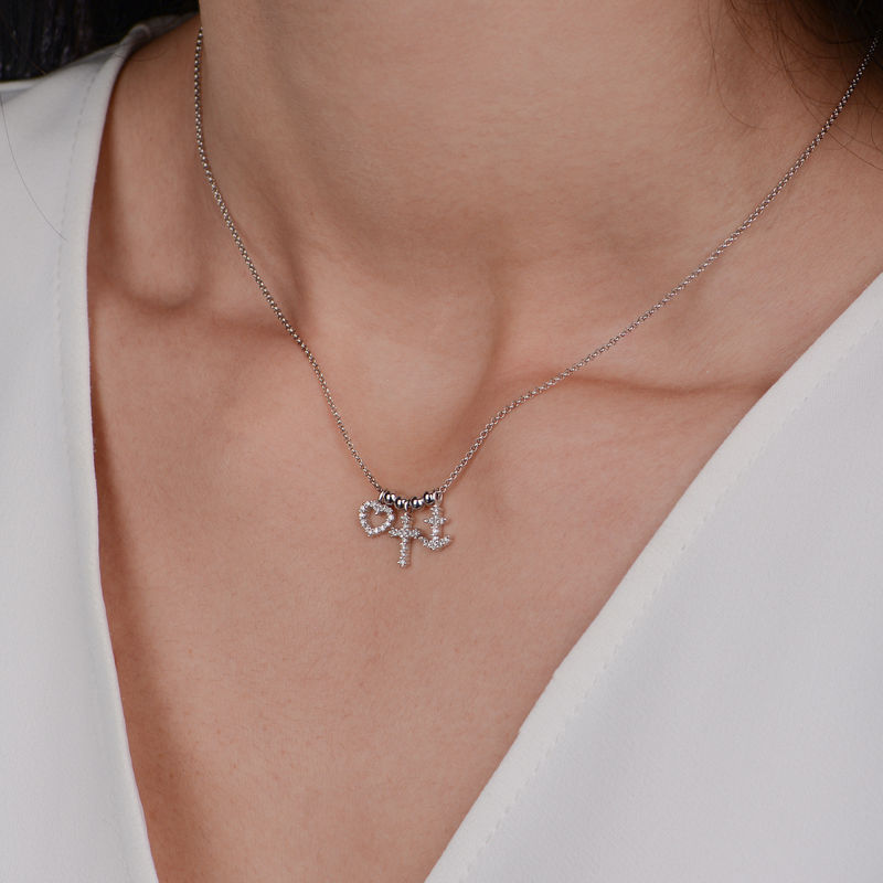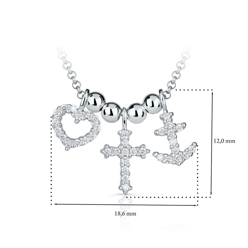 Mamičky nemôžu prísť skrátka, preto prichádzame s úplnou novinkou a to s kombinovaným príveskom symbolizujúce Lásku, vieru a nádej. Tri prívesky v tvare srdca, krížika a kotvičky sú vyrobené z bieleho 14k zlata. Celkovo je náhrdelník posiaty 37 čírymi zirkónmi Preciosa. Medzi jednotlivými symbolmi sú pridané oddeľovače v podobe drobných celozlatých guľôčok. Retiazka je súčasťou náhrdelníka, prívesky nie sú navlečené na pevno a ležérne sa tak pohybujú zo strany na stranu. Zlatý prívesok je opatrený puncovou značkou 585/1000 od štátneho puncového úradu. Všetky rozmery sú podrobne rozkreslené v podpornom fotografiu.
