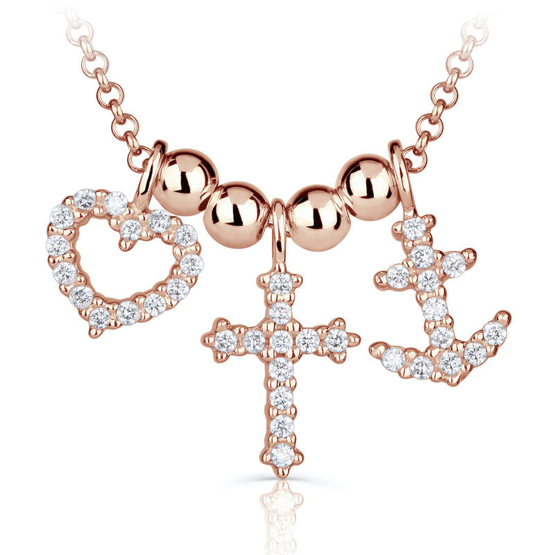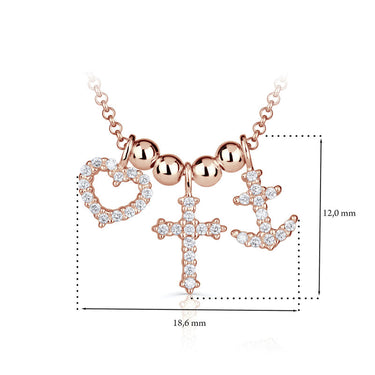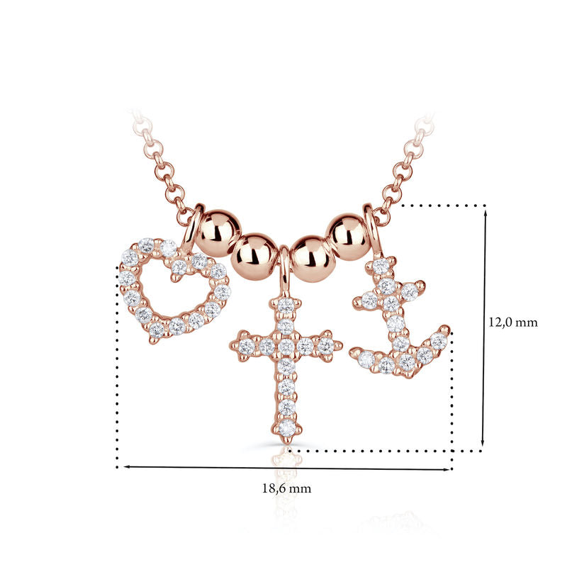 Mamičky nemôžu prísť skrátka, preto prichádzame s úplnou novinkou a to s kombinovaným príveskom symbolizujúce Lásku, vieru a nádej. Tri prívesky v tvare srdca, krížika a kotvičky sú vyrobené z ružového 14k zlata. Celkovo je náhrdelník posiaty 37 čírymi zirkónmi Preciosa. Medzi jednotlivými symbolmi sú pridané oddeľovače v podobe drobných celozlatých guľôčok. Retiazka je súčasťou náhrdelníka, prívesky nie sú navlečené na pevno a ležérne sa tak pohybujú zo strany na stranu. Zlatý prívesok je opatrený puncovou značkou 585/1000 od štátneho puncového úradu. Všetky rozmery sú podrobne rozkreslené v podpornom fotografiu.
