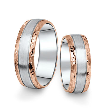 Dámsky snubný prsteň v kombinácii bieleho a ružového 14 karátového zlata 585/1000, zdobený ručnou rytinou. Prsteň je široký 7 mm a má povrch v kombinácii lesklého a matného prevedenie.