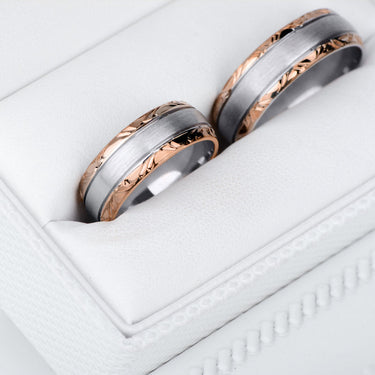 Pánsky snubný prsteň v kombinácii bieleho a ružového 14 karátového zlata 585/1000, zdobený ručnou rytinou. Prsteň je široký 7 mm a má povrch v kombinácii lesklého a matného prevedenie.
