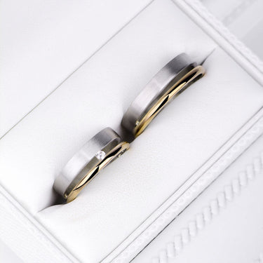 Pánsky snubný prsteň v kombinácii bieleho a červeného 14-karátového zlata 585/1000. Prsteň nie je osadený žiadnym kameňom, je široký 7 mm a má povrch v kombinácii lesklého a matného prevedenie.