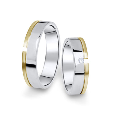 Pánsky snubný prsteň v kombinácii bieleho a ružového 14-karátového zlata 585/1000. Prsteň nie je osadený žiadnym kameňom, je široký 5 mm a má povrch v kombinácii lesklého a matného prevedenie.