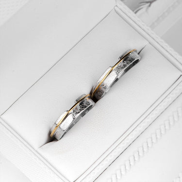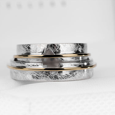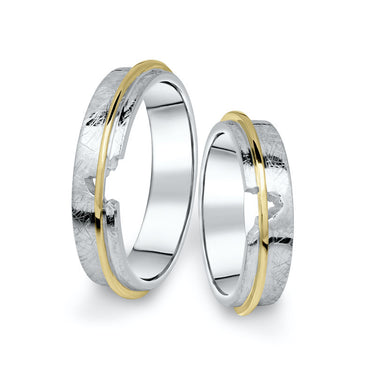 Pánsky snubný prsteň v kombinácii bieleho a žltého 14 karátového zlata 585/1000. Prsteň nie je osadený žiadnym kameňom, je široký 7 mm a má povrch v kombinácii lesklého a ľadového prevedení.