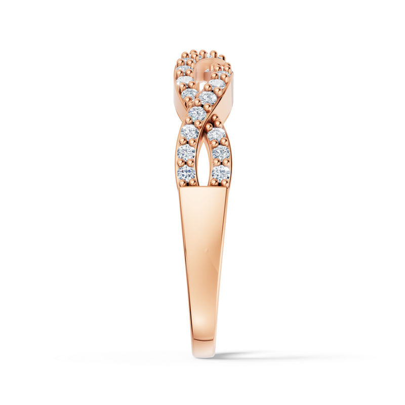 Prsten je vyrobený ze 14 karátového růžového zlata a je osazen celkem 37 přírodními diamanty briliantového brusu o celkové hmotnosti 0.296 ct. Diamanty v kvalitě SI1, barvy G a s excelentním brusem vynikají krásnou jiskrou a dodávají šperku jemný, luxusní vzhled. Kameny jsou precizně zasazeny do elegantní obroučky, která působí velmi harmonicky a nadčasově. Díky svému jemnému designu je prsten ideální jak pro samostatné nošení, tak i pro kombinaci s dalšími šperky. Šperk je uložen v luxusní dárkové krabičce a doplněn certifikátem pravosti.