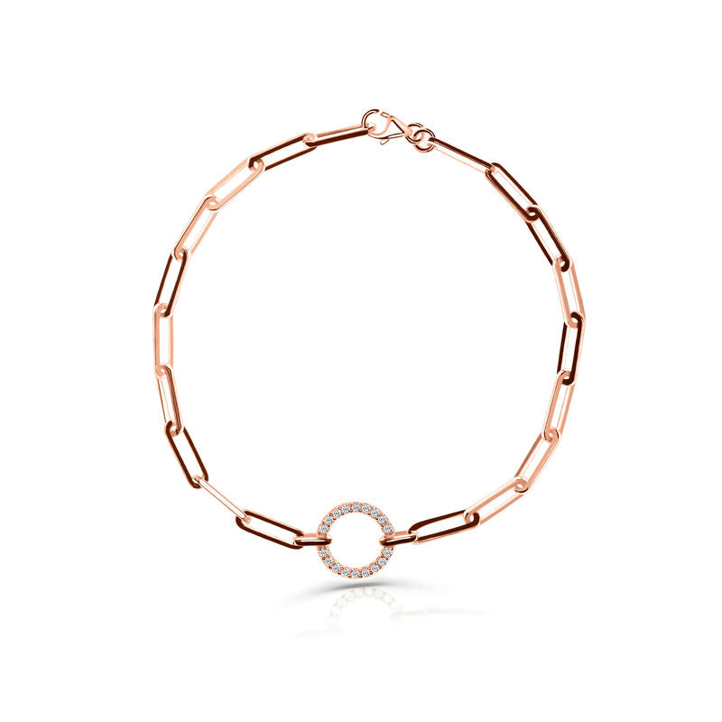 Dámsky retiazkový náramok spoločne s kruhovým komponentom je vyrobený z ružového 14k 585/1000 zlata. Na komponente je usadených 18 briliantov okrúhleho brusu o celkovej váhe 0.072 ct. Náramok má obvod 16,3 cm a dorazí uložený v luxusnej krabičke spoločne s certifikátom pravosti.