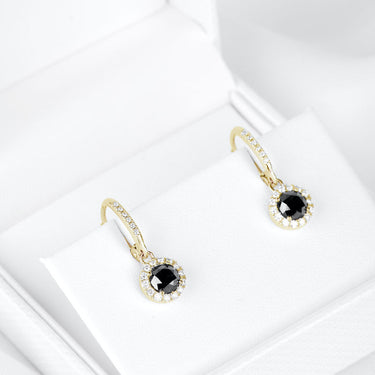 Elegantné visiace náušnice Danfil Diamonds z žltého 14 karátového zlata so zapínaním klapka zvýraznené 40 žiarivými diamanty okrúhleho brusu o celkovej váhe 0.3 ct. Náušniciam dominujú 2 stredovej čierne diamanty v celkovej váhe 1.306 ct. Šperk je uložený v luxusnej darčekovej krabičke spolu s certifikátom pravosti.