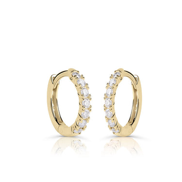 Krásne náušnice okrúhleho tvaru zo žltého 14-karátového zlata, zdobené 0,350 ct okrúhlymi brúsenými iskrivými diamantmi. Tieto náušnice majú lesklý povrch. Šperk sa dodáva v luxusnej darčekovej krabičke spolu s certifikátom pravosti.