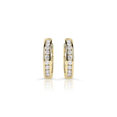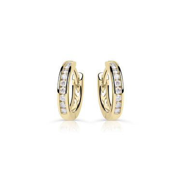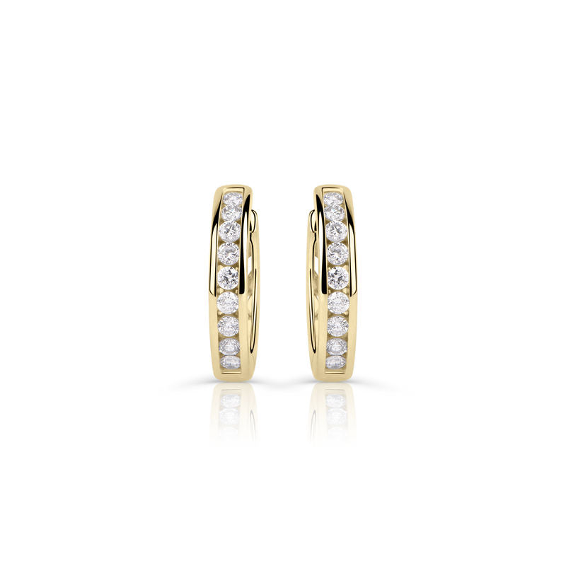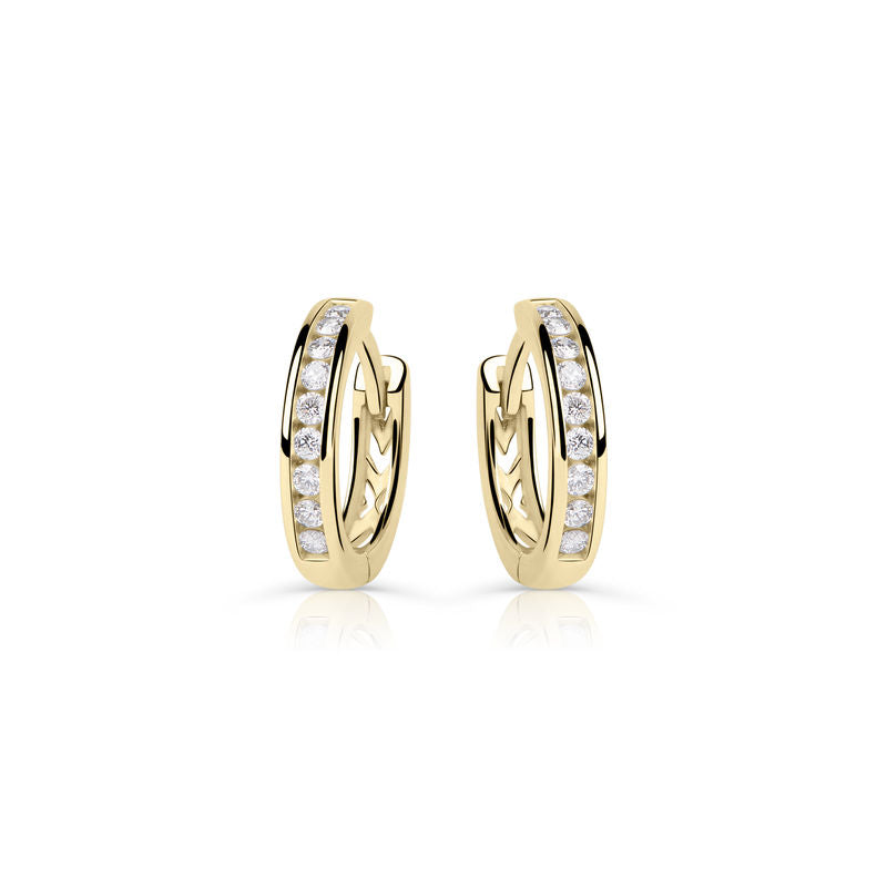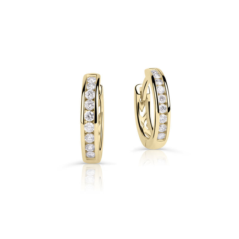 Krásne náušnice okrúhleho tvaru zo žltého 14-karátového zlata, zdobené 0,216 ct trblietavými diamantmi okrúhleho brusu. Tieto náušnice majú lesklý povrch. Šperk sa dodáva v luxusnej darčekovej krabičke spolu s certifikátom pravosti.