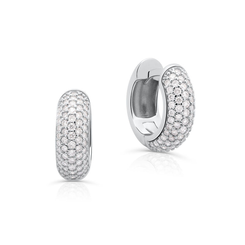 Krásne náušnice kruhového tvaru z bielého 14 karátového zlata, ozdobené 122 trblietavými diamantmi okrúhleho brusu o celkovej váhe 0.884 ct. Tieto náušnice majú lesklý povrch. Šperk je uložený v luxusnej darčekovej krabičke spolu s certifikátom pravosti.