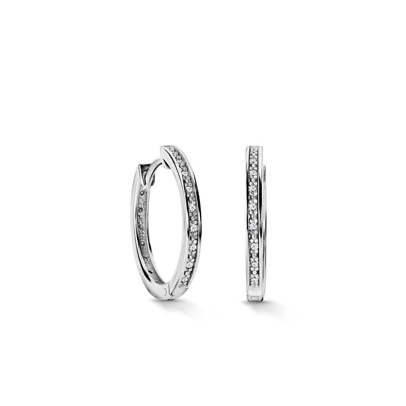 Elegantné okrúhle náušnice zo 14-karátového bieleho zlata, zvýraznené 36 okrúhlymi briliantmi s celkovou hmotnosťou 0,128 ct. Tieto náušnice majú lesklý povrch. Šperk je dodávaný v luxusnej darčekovej krabičke spolu s certifikátom pravosti.