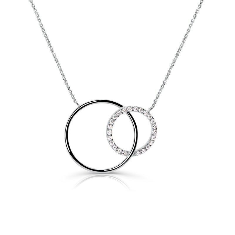 Luxusný náhrdelník okrúhleho tvaru v kombinácii dvoch prepojených kruhov z bieleho 14-karátového zlata. Doplnený 24 iskrivými diamantmi s okrúhlym brusom s celkovou hmotnosťou 0,240 ct. Šperk sa dodáva v luxusnej darčekovej krabičke spolu s certifikátom pravosti.