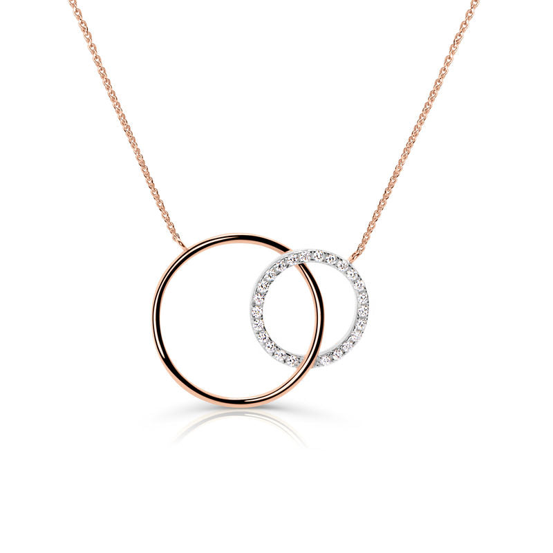 Luxusný okrúhly náhrdelník v kombinácii dvoch prepojených kruhov z bieleho a ružového 14K zlata. Doplnený 24 iskrivými diamantmi s okrúhlym brusom s celkovou hmotnosťou 0,240 ct. Šperk sa dodáva v luxusnej darčekovej krabičke spolu s certifikátom pravosti.
