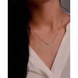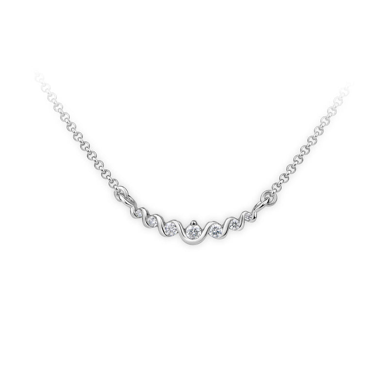 Nádherný náhrdelník zo 14-karátového bieleho zlata so 7 trblietavými diamantmi okrúhleho brusu s celkovou hmotnosťou 0,105 ct. Prívesok má snehobiely lesklý povrch a pevne navlečenú retiazku. Šperk sa dodáva v luxusnej darčekovej krabičke spolu s certifikátom pravosti.