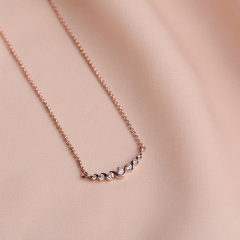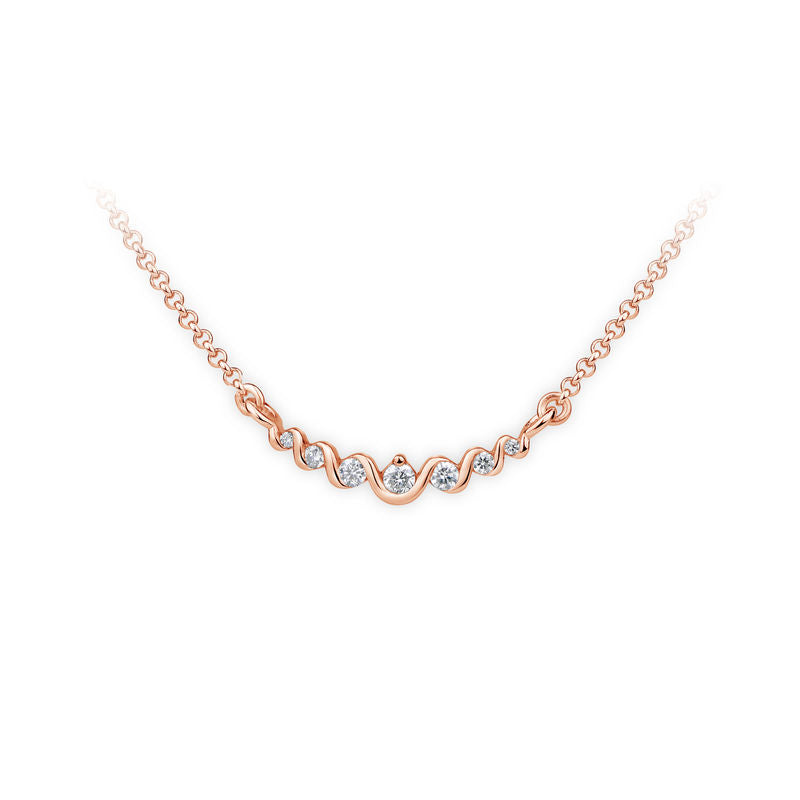 Elegantný náhrdelník zo 14-karátového ružového zlata so 7 trblietavými diamantmi okrúhleho brusu s celkovou hmotnosťou 0,105 ct. Prívesok má lesklú povrchovú úpravu a pevne navlečenú retiazku. Šperk sa dodáva v luxusnej darčekovej krabičke spolu s certifikátom pravosti.