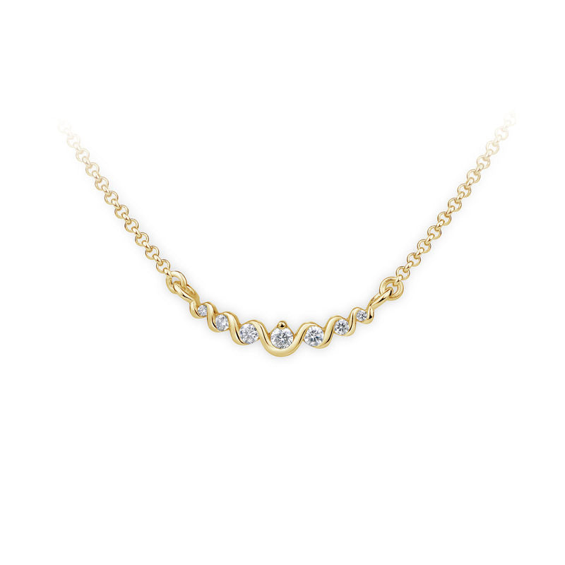 Krásny náhrdelník zo 14-karátového žltého zlata so 7 trblietavými diamantmi okrúhleho brusu s hmotnosťou 0,105 ct. Prívesok má lesklý povrch a pevne navlečenú retiazku. Šperk sa dodáva v luxusnej darčekovej krabičke spolu s certifikátom pravosti.