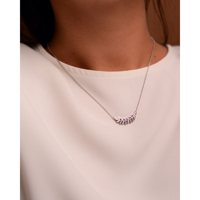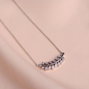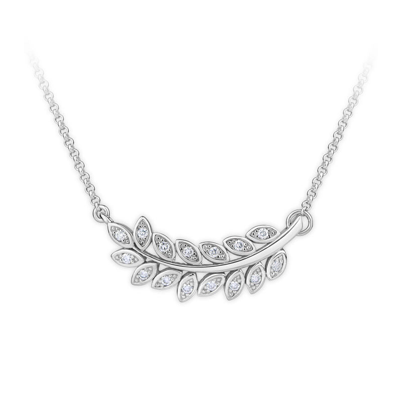 Elegantný náhrdelník zo 14-karátového bieleho zlata s 15 trblietavými diamantmi s okrúhlym brusom a hmotnosťou 0,135 ct. Prívesok má snehobiely lesklý povrch a pevne navlečenú retiazku. Šperk sa dodáva v luxusnej darčekovej krabičke spolu s certifikátom pravosti.