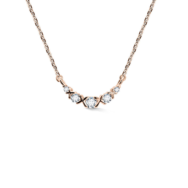 Tento jemný a ženský náhrdelník zo 14-karátového ružového zlata očarí harmonickou kombináciou teplého zlatého odtieňa a diamantového lesku. 5 okrúhlych briliantov s kvalitou SI1, farbou G a vynikajúcim brusom s celkovou hmotnosťou 0,250 ct dodáva šperku romantický a elegantný charakter. Prívesok s lesklým povrchom je pevne navlečený na retiazke dlhej 43 cm. Náhrdelník je uložený v luxusnej darčekovej krabičke a dodáva sa s certifikátom pravosti - ideálna voľba pre ženy, ktoré milujú jemný luxus a nadčasový štýl.