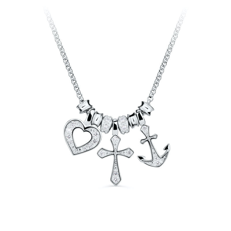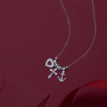Láska, viera, nádej - to sú symboly našej kolekcie kombinovaných príveskov. Tri prívesky v tvare krížika, srdca a kotvičky sú vyrobené z bieleho 14k zlata. Celkovo je náhrdelník posiaty 28 diamanty o celkovej váhe 0,138 ct. Medzi jednotlivými symbolmi sú pridané oddeľovače v podobe drobných celozlatých a diamantových guličiek. Retiazka s dĺžkou 43 cm je súčasťou náhrdelníka, prívesky nie sú navlečené na pevno a ležérne sa tak pohybujú zo strany na stranu.