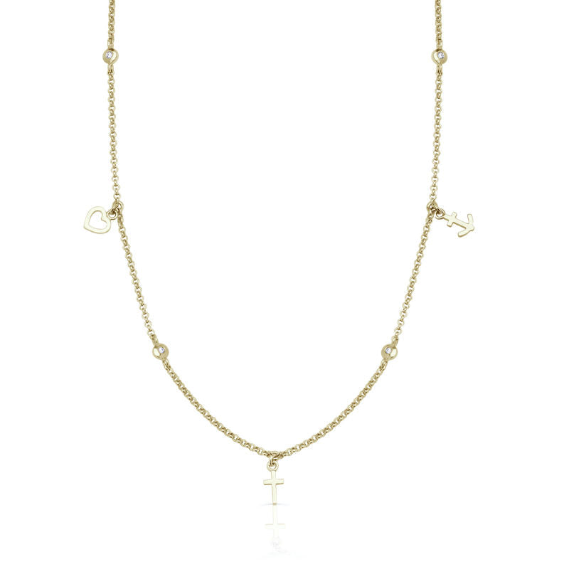 Kolekciu náhrdelníkov sme stvárnili v duchu symboliky - láska, viera a nádej. Tri pojmy a tri prívesky stelesňujúca dnešnú dobu. Celozlaté prívesky v tvare krížika, srdca a kotvičky sú vyrobené z žltého 14 karátového zlata. Medzi jednotlivými symbolmi sú pridané oddeľovače v podobe štyroch briliantov v guľatom lôžku o celkovej váhe 0,016 ct. Retiazka s dĺžkou 40 cm je súčasťou náhrdelníka a prívesky sú na ňom na pevno uchytené.