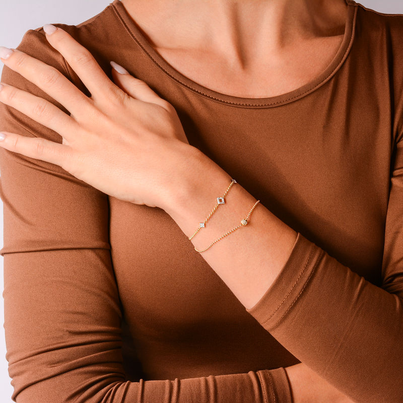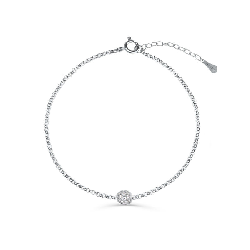 Dámsky retiazkový náramok so zlatým komponentom v tvare guličky z bielého 14 karátového zlata s diamantmi. Zapínanie je riešené v rozpätí 16 až 18,5 cm. Na komponentu je umiestnených celkom 24 briliantov o celkovej váhe 0.088 ct. Náramok bude uložený v luxusnej krabičke spolu s certifikátom pravosti.