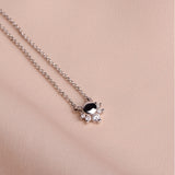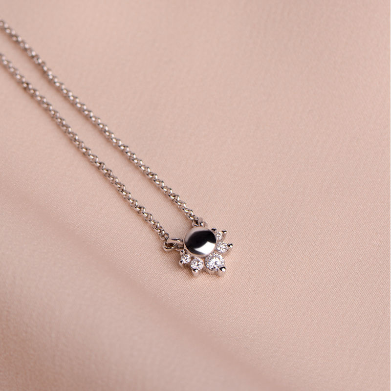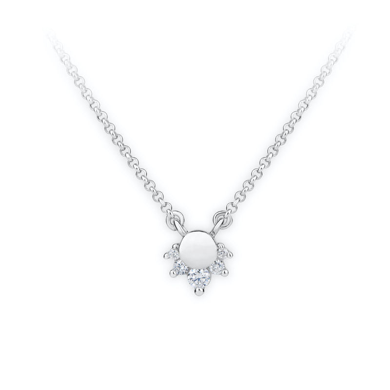 Krásny prívesok z bieleho 14 karátového zlata doplnený 5 krásnymi diamantmi okrúhleho brusu o celkovej váhe 0.107 ct. Prívesok má snehovo biely lesklý povrch. Šperk je uložený v luxusnej darčekovej krabičke spolu s certifikátom pravosti.