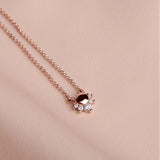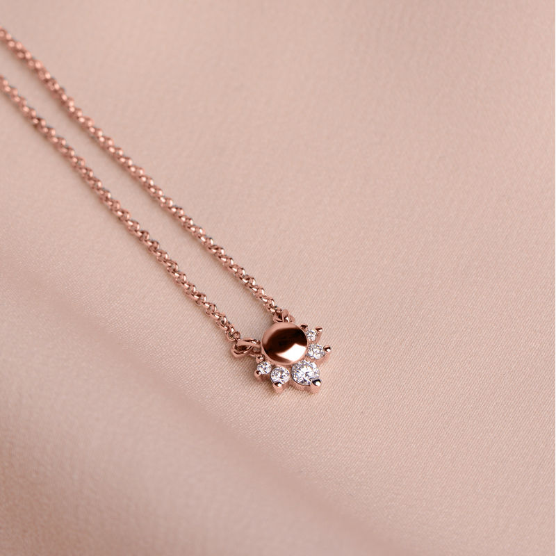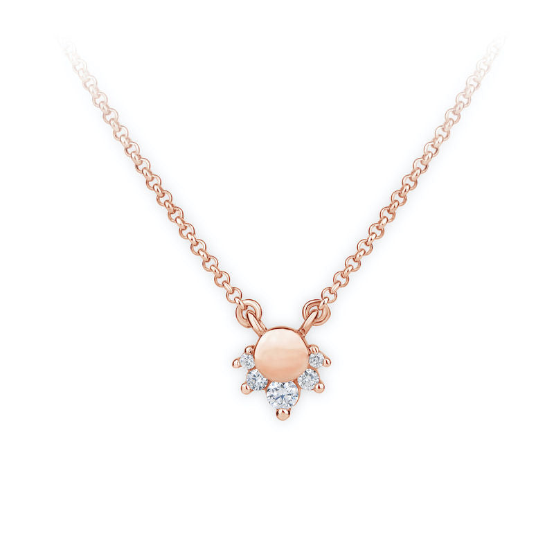 Krásny prívesok z ružového 14 karátového zlata doplnený 5 krásnymi diamantmi okrúhleho brusu o celkovej váhe 0.107 ct. Prívesok má lesklý povrch a na pevno navlečený retiazku. Šperk je uložený v luxusnej darčekovej krabičke spolu s certifikátom pravosti.