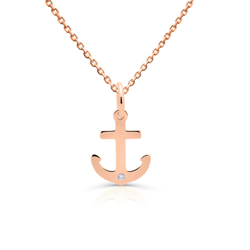 Luxusný prívesok KOTVA, ktorá je považovaná predovšetkým ako symbolické znázornenie nádeje, sily a stability. Je vyrobený z ružového 14 karátového zlata doplnený žiarivým diamantom o váhe 0.004 ct okrúhleho brusu. Prívesok má lesklý povrch. Šperk je uložený v luxusnej darčekovej krabičke spolu s certifikátom pravosti.