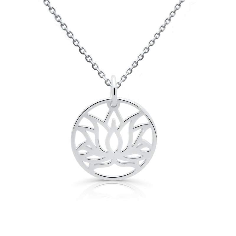 Luxusný celozlatý prívesok okrúhleho tvaru s lotosovým kvetom z bielého 14 karátového zlata. Prívesok má lesklý povrch. Šperk je uložený v luxusnej darčekovej krabičke.