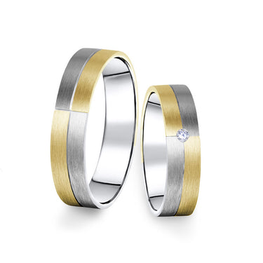 Dámsky snubný prsteň v kombinácii bieleho a žltého 14-karátového zlata 585/1000 s krásnym stredovým briliantom okrúhleho brusu o váhe 0,027 ct. Prsteň je široký 5 mm a má matný - brúsený povrch.