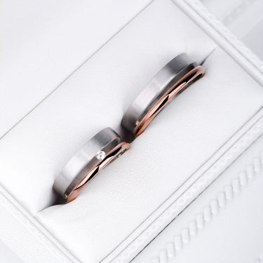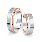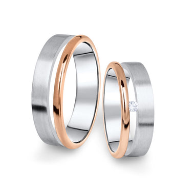 Dámsky snubný prsteň v kombinácii bieleho a ružového 14-karátového zlata 585/1000 s krásnym stredovým briliantom okrúhleho brusu o váhe 0,035 ct. Prsteň je široký 7 mm a má povrch v kombinácii lesklého a matného prevedenie.