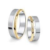 Dámsky snubný prsteň v kombinácii bieleho a žltého 14-karátového zlata 585/1000 s krásnym stredovým briliantom okrúhleho brusu o váhe 0,035 ct. Prsteň je široký 7 mm a má povrch v kombinácii lesklého a matného prevedenie.