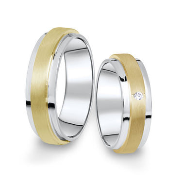 Dámsky snubný prsteň v kombinácii bieleho a žltého 14 karátového zlata 585/1000 s krásnym stredovým briliantom okrúhleho brusu o váhe 0,023 ct. Prsteň je široký 6,5 mm a má povrch v kombinácii lesklého a matného prevedenie.