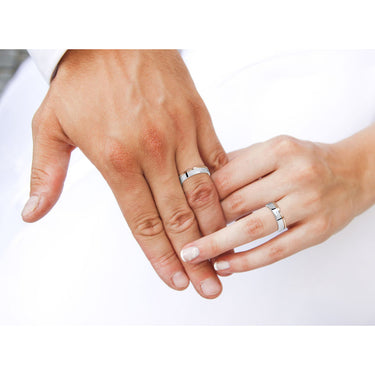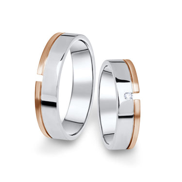 Dámsky snubný prsteň v kombinácii bieleho a červeného 14-karátového zlata 585/1000 s krásnym stredovým briliantom okrúhleho brusu o váhe 0,025 ct. Prsteň je široký 5 mm a má povrch v kombinácii lesklého a matného prevedenie.