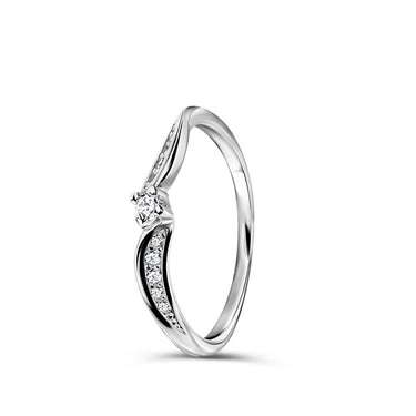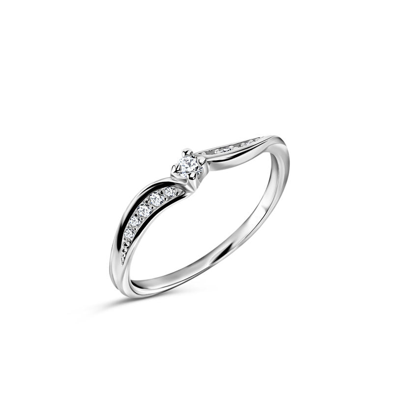 Krásný dámský prsten z kolekce Danfil Diamonds vyrobený z bílého 14 karátového zlata osazený 11 brilianty o celkové váze 0.100 ct. Prsten má lesklý povrch. Šperk je uložen v luxusní dárkové krabičce spolu s certifikátem pravosti.