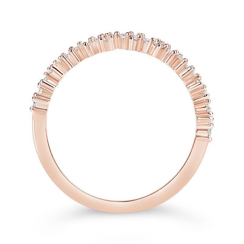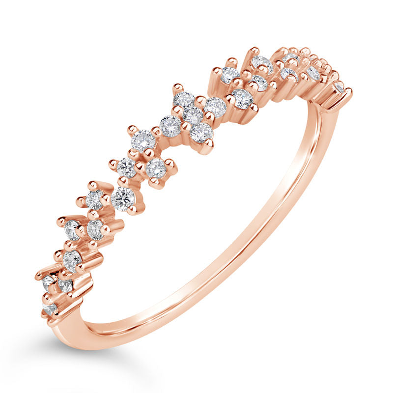 Luxusní dámský prsten z kolekce Danfil Diamonds vyrobený z růžového 14 karátového zlata ozdobený 26 brilianty o váze 0.166 ct. Prsten má lesklý povrch. Šperk je uložen v luxusní dárkové krabičce spolu s certifikátem pravosti.