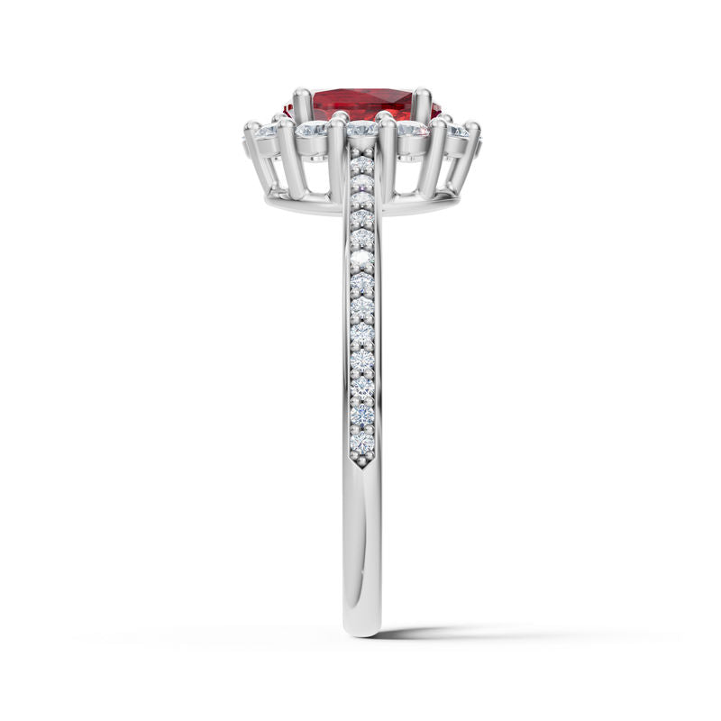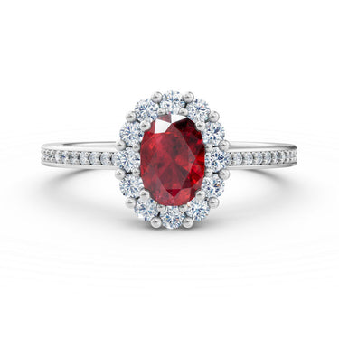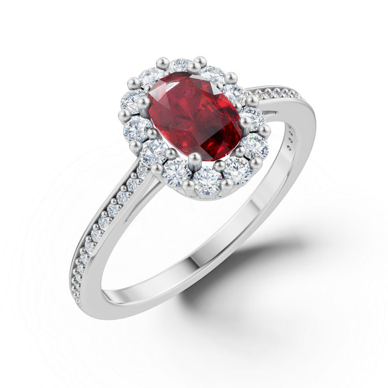 Stylový a zároveň nadčasový dámský prsten ze 14 karátového bílého zlata okouzlí elegantní kombinací středového oválného rubínu a postranních diamantů v kvalitě SI1, barvy G s excelentním brusem. Celková hmotnost kamenů je 1.468 ct, což prstenu dodává výrazný, ale stále jemný luxusní charakter. Prsten je uložen v luxusní dárkové krabičce a doplněn certifikátem pravosti, díky čemuž je ideální volbou pro ženy, které milují sofistikovaný šperk s výjimečným detailem.
