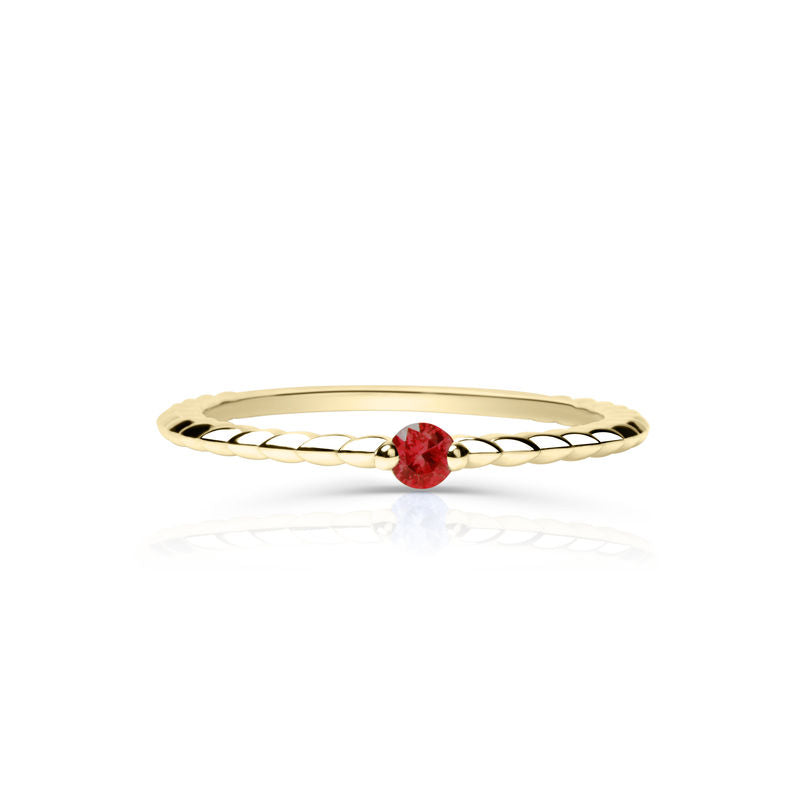 Nadčasový a elegantní prsten ze 14 karátového žlutého zlata zaujme svou vytříbenou krásou a dokonale vyváženým designem. Dominantou šperku je červený rubín kulatého brusu round o celkové váze 0.090 ct, jehož sytě červený odstín dodává prstenu výrazný třpyt a luxusní charakter. Precizní osazení zvýrazňuje přirozený lesk drahokamu a nechává vyniknout jeho jedinečnou barvu i čistotu. Lesklý povrch a čisté, jemně tvarované linie podtrhují eleganci celého provedení, díky čemuž prsten působí lehce, sofistikovaně a nadčasově. Uložen v luxusní dárkové krabičce a doplněn certifikátem pravosti je ideální volbou pro ženy, které hledají výjimečný šperk vyzařující noblesu, styl a osobitý půvab.