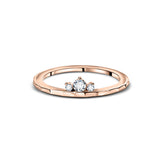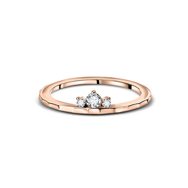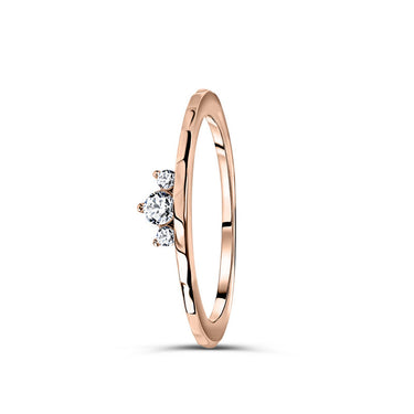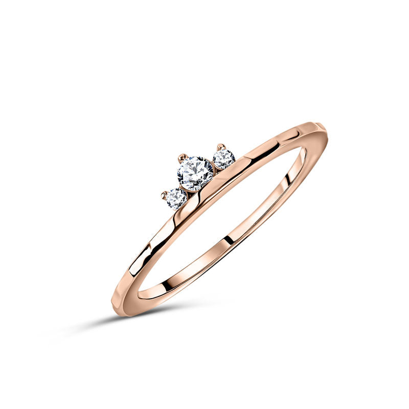 Elegancia a zmyselnosť. Prsteň zdobia tri okrúhle brilianty s celkovou hmotnosťou 0,090 ct vsadené do originálneho okrúhleho rámu zo 14-karátového ružového zlata. Šperk sa dodáva v luxusnej krabičke spolu s certifikátom pravosti.