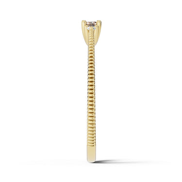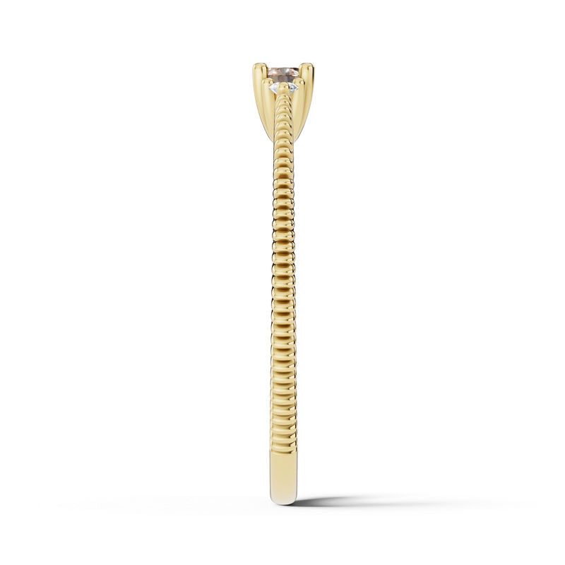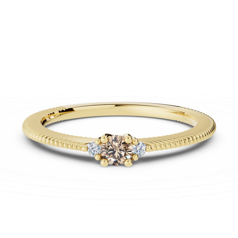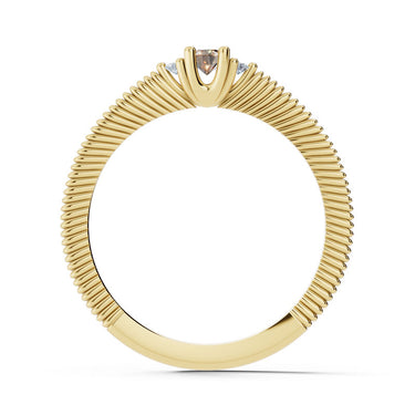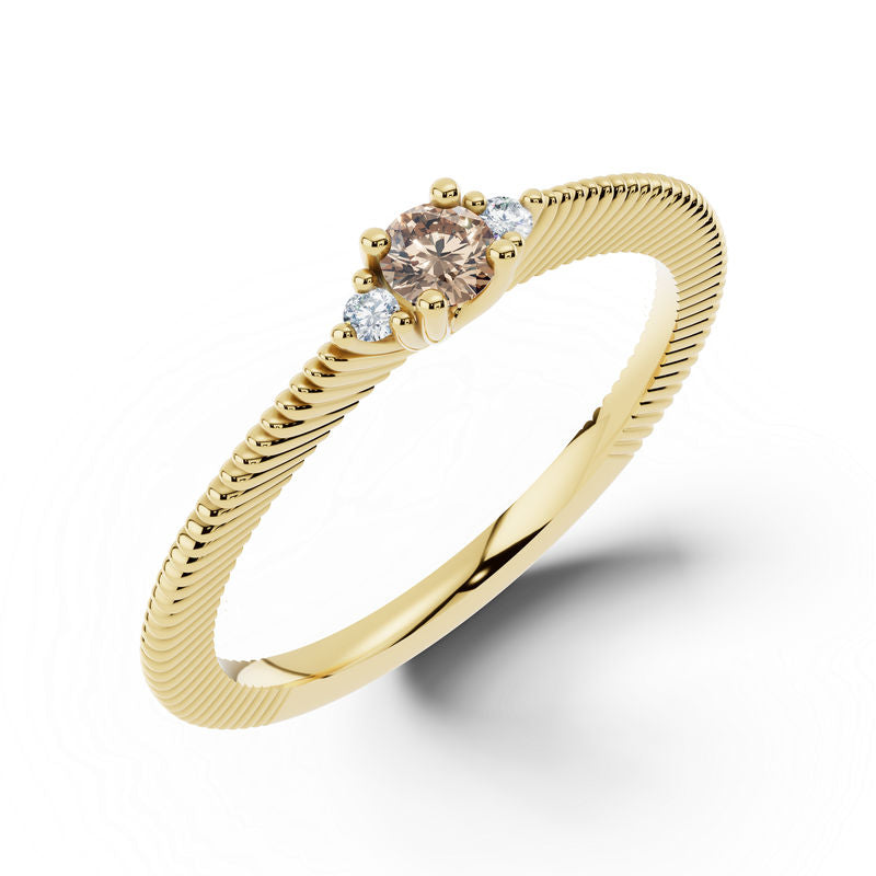 Nadčasový a elegantní prsten ze 14 karátového žlutého zlata zaujme svou vytříbenou krásou a dokonale vyváženým designem. Dominantou šperku je přírodní zirkon kulatého brusu (Nature Zircon Round), který je elegantně doplněn dvěma postranními diamanty v kvalitě SI1, barva G a excelentní brus. Celková hmotnost kamenů je 0.190 ct, což prstenu dodává jemný, přesto výrazný třpyt a luxusní charakter. Precizní osazení zvýrazňuje přirozený lesk všech drahokamů a podtrhuje sofistikovaný vzhled šperku. Lesklý povrch a čisté, jemně tvarované linie prstenu umocňují jeho eleganci, díky čemuž působí lehce, nadčasově a harmonicky. Prsten je uložen v luxusní dárkové krabičce a doplněn certifikátem pravosti. Je ideální volbou pro ženy, které hledají jedinečný šperk spojující noblesu, eleganci a osobitý půvab.