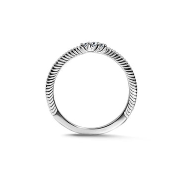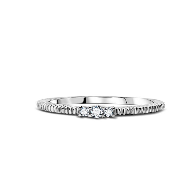 Elegancia a zmyselnosť. Prsteň zdobia tri okrúhle brilianty s celkovou hmotnosťou 0,062 ct vsadené do originálnej okrúhlej súpravy zo 14-karátového bieleho zlata. Šperk sa dodáva v luxusnej krabičke spolu s certifikátom pravosti.