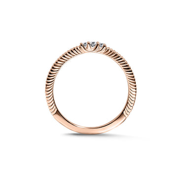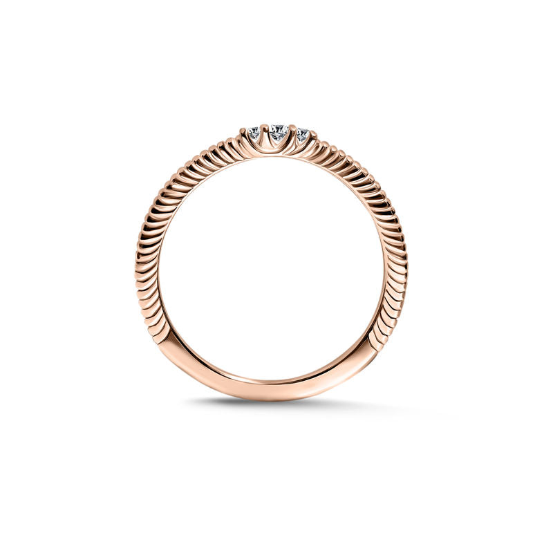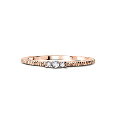 Elegancia a zmyselnosť. Prsteň zdobia tri okrúhle brilianty s celkovou hmotnosťou 0,062 ct vsadené do originálneho rámu zo 14-karátového ružového zlata. Šperk sa dodáva v luxusnej krabičke spolu s certifikátom pravosti.